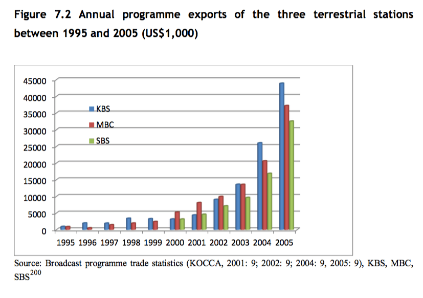 Consequently, KBS with its “relatively longer history in programme exports than MBC or SBS, the two other terrestrial stations” arguably benefitted the most from the reduced state intervention and support policies as evident from how its annual programme exports were the highest among the three major terrestrial broadcasting stations between 2003 to 2005 (Jeon 101). Full House can therefore be regarded as a beneficiary of these government policies that were instrumental in its export success.