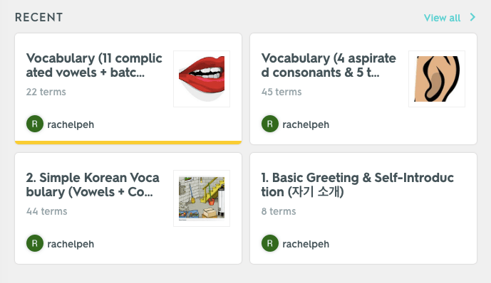By doing so, I am joining an already vibrant community of people who have made their own sets of Quizlet flashcards for the Korean language but I had hoped to contribute with a different set of vocabulary and a more systematic way of learning by grouping these words and phrases by the different kinds of vowels and consonants used.