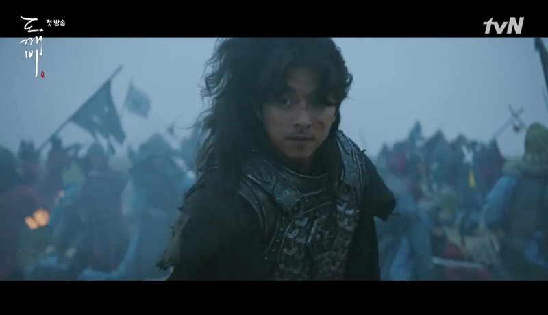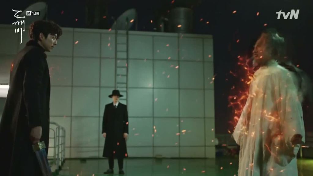 The evil spirit, Park Joong-heon, who tried to harm Eun-tak vanishes as Kim Shin swings his sword at him. Photo Credit: tvN