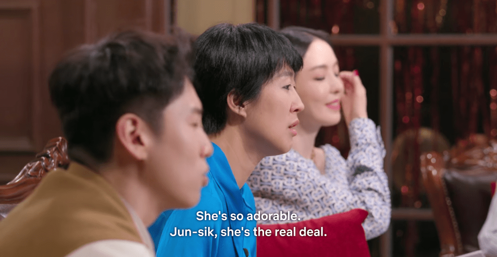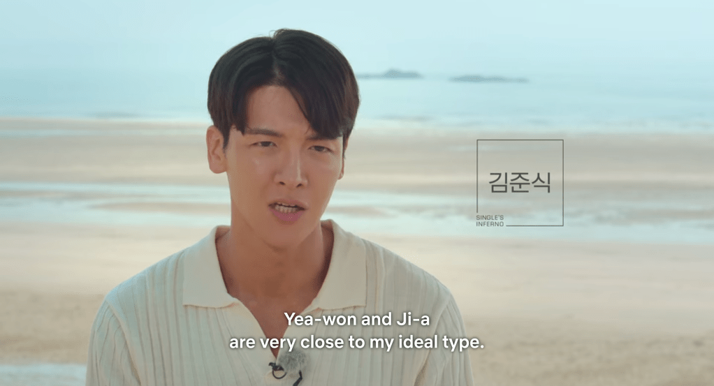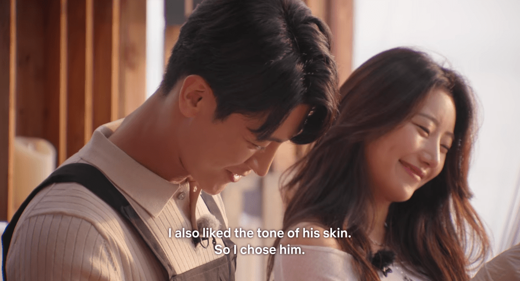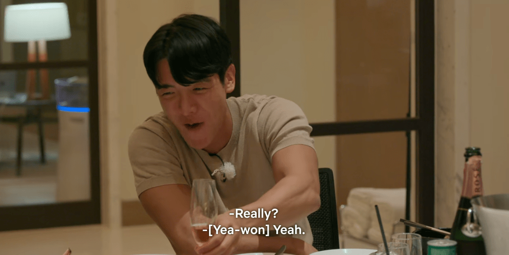 Yeawon looking gorgeous as she made her entrance. Photo Credit: NetflixYeawon’s entrance brought forth multiple gasps of ‘Wow’ from her fellow castmates but guess who was also looking at her the whole time? At least the producers were on point with their song choice Photo Credit: NetflixBy some coincidence (or fate?), Yeawon sat next to Junsik and he talked to her for the first time. I felt like this was the start of something special between them because we could often see these two sitting side-by-side in group settings in later episodes. Photo Credit: NetflixYeawon probably made a great first impression because Junsik names her as one of the girls who were his ideal type. Photo Credit: NetflixAww he loves her satoori too Photo Credit: Netflix